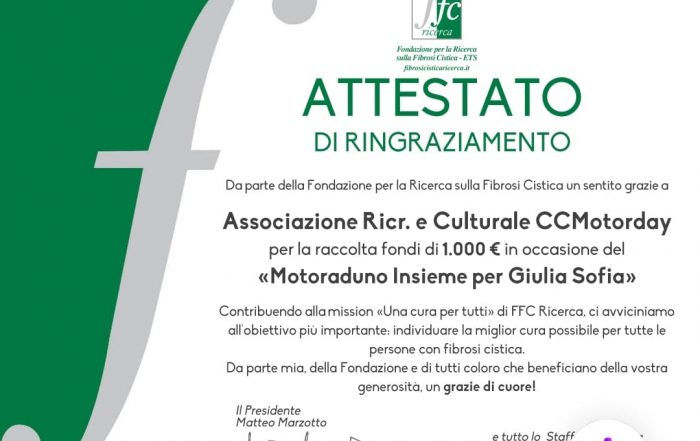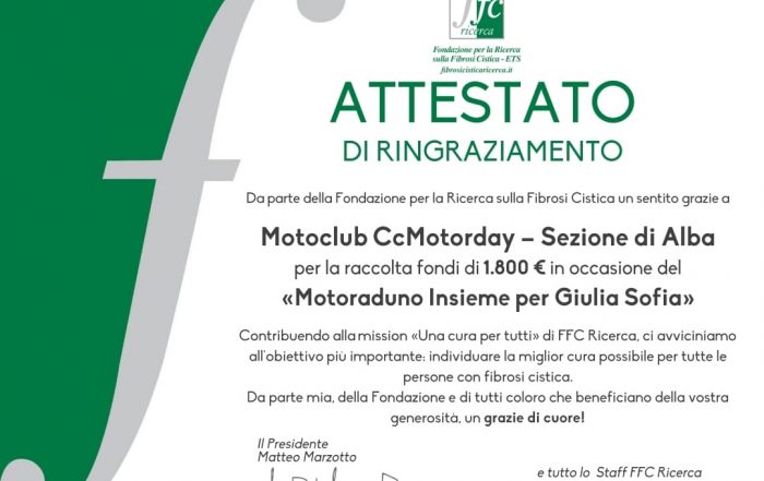 Per la serie parlano di Noi... Condivido con tutti gli l'attestati di ringraziamento pervenuti dalla Delegazione "Insieme per Giulia Sofia" - FFC Ricerca ETS al quale in occasione del 2° Motogiro Insieme per Gilia Sofia sono stati donati 2800 euro per la ricerca. CCMotorday - Sez. Alba CCMotorday -