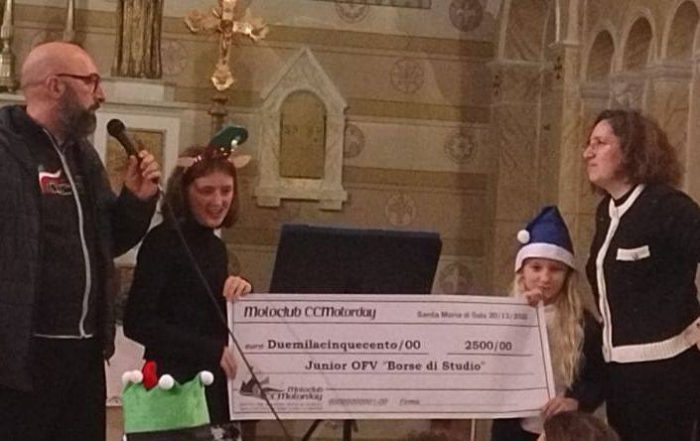 L'associazione CCMotorday a donato un assegno di 2.500 euro, destinato alle borse di studio per i giovani allievi della Junior ODV. Un gesto di grande generosità che ci riempie il cuore reso possibile dal successo del nostro raduno nazionale svoltosi a Lignano lo scorso maggio. la Junior OFV che