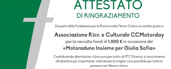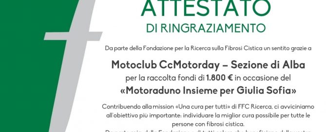 "Condivido con voi Soci e amici del CCMotorday questo ringraziamento e Speciale Attestazione pervenuta dall'Associazione Nazionale di Volontariato Cornelia de Lange, inerente la